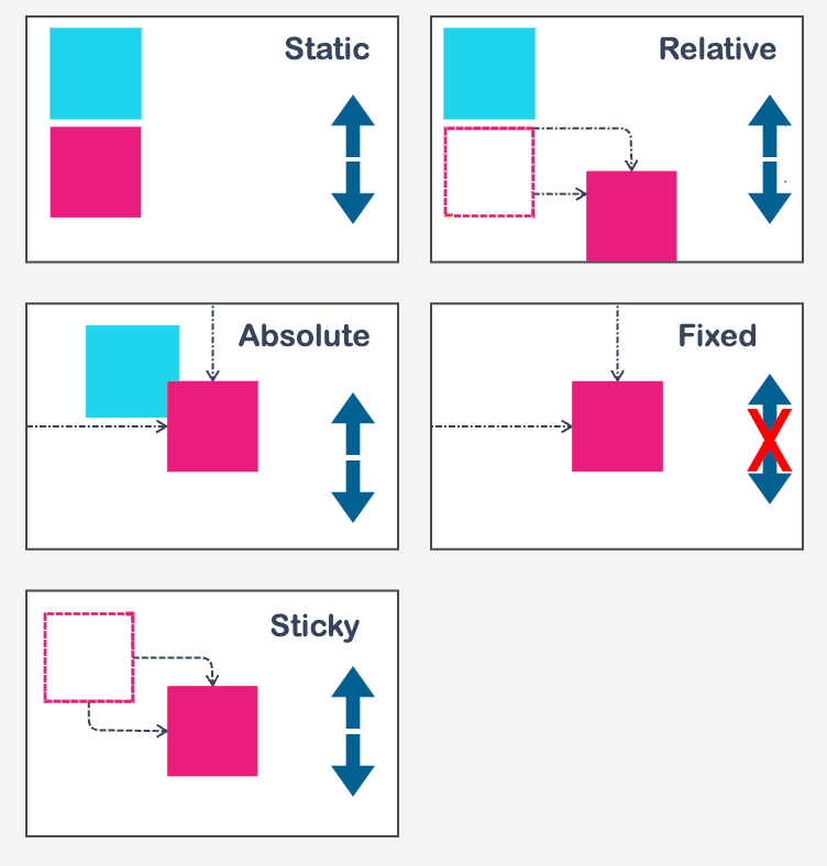 positioncontrola o posicionamento dos elementosstaticé o padrãorelativemantém o elemento no fluxoabsoluteremove do fluxofixedfixa na telastickycombina relativo e fixo